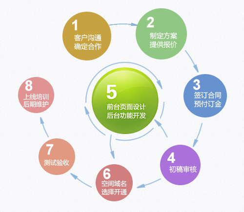 網站建設流程概述:客戶溝通,確定合作意向→制定建設方案,提供報價→簽訂合同,預付定金→初稿審核→前臺頁面設計,后臺程序開發(fā)→空間及域名選擇、開通→測試驗收→上線培訓,后期維護