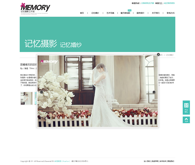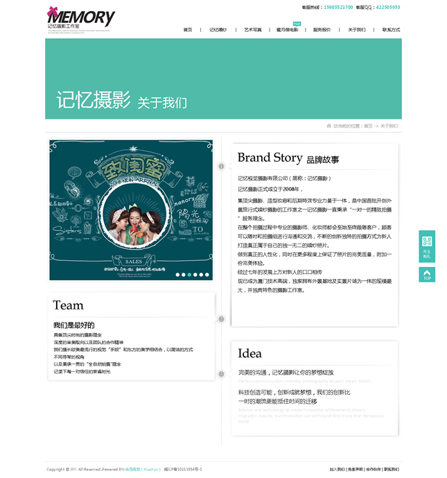 記憶視覺攝影有限公司(簡稱:記憶攝影)記憶攝影正式成立于2008年,集頂尖攝影、造型妝容和后期特效專業(yè)力量于一體,是中國首批開創(chuàng)外景旅行式婚紗攝影的工作室之一記憶攝影一直秉承“一對一的精致拍攝”服務(wù)理念。在整個拍攝過程中專業(yè)的攝影師、化妝師都會至始至終跟隨客戶,顧客可以隨時和拍攝組進行溝通和交流,不斷的創(chuàng)新獨特的拍攝方式為新人打造真正屬于自己的獨一無二的婚紗照片。做到真正的人性化,同時在更多程度上保證了照片的完美質(zhì)量,附加一份完美體驗。